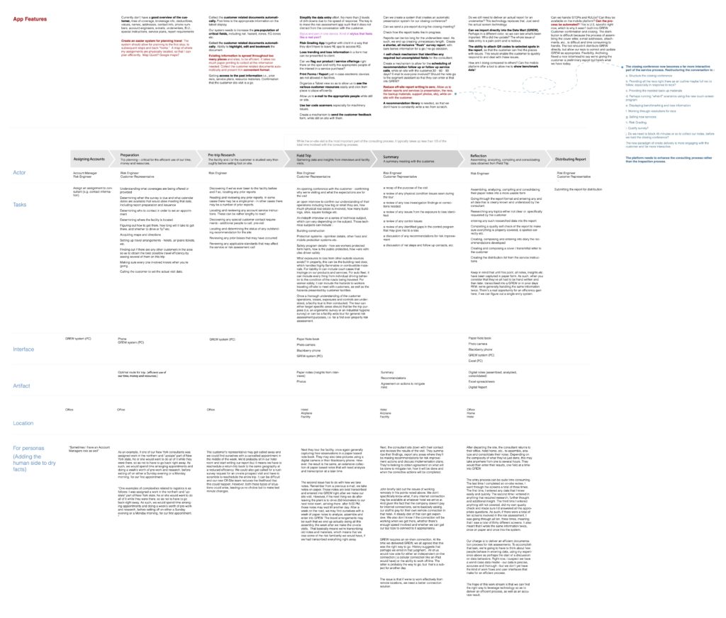 We began with desk research to map the existing toolset, then conducted 18 field interviews. Key findings included documentation friction consuming significant time, customers wanting more transparency during visits, cognitively heavy risk grading logic, and off-site reporting being the biggest bottleneck.